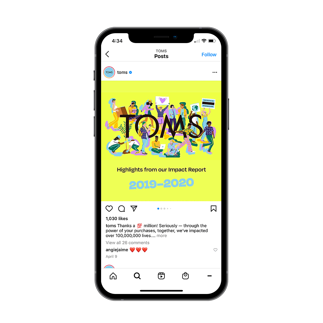 TOMS underwent a giving model shift and rebrand to appeal to a new generation of consumers and givers. It introduced a new brand look and messaging platform with this 2019–2020 Impact Report, which focused on sharing past giving numbers and emphasizing new grassroots organizations serving their communities.